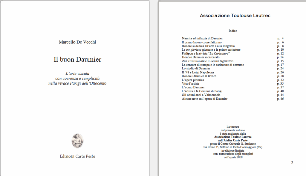 Libro manufatto di 48 pagine formato 16x20cm, rilegato con filo di lino ritorto e stampato su carta Accademia Fabriano in 80 esemplari nel 2008 dai soci dell’Associazione Toulouse Lautrec