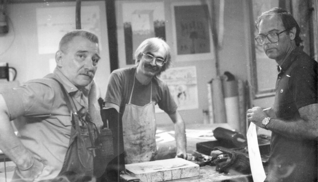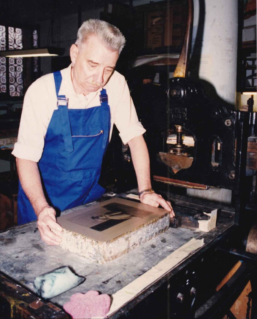 Il maestro Simon non era una persona che parlava molto ma piuttosto pratica. La tecnica litografica era da lui insegnata con poche parole e molti esempi concreti. Il suo intervento si limitava soprattutto all’uso come matrice della pietra calcarea, mentre per le matrici di zinco o di alluminio delegava quasi tutto a me. Era una persona cortese e disponibile ma a causa delle sue difficoltà con l’italiano gli allievi preferivano rivolgersi a me per ogni chiarimento tecnico. E così diventavo in qualche lezione, il vero punto di riferimento del corso ma lui gentilmente lasciava fare senza sentirsi menomato in autorevolezza.