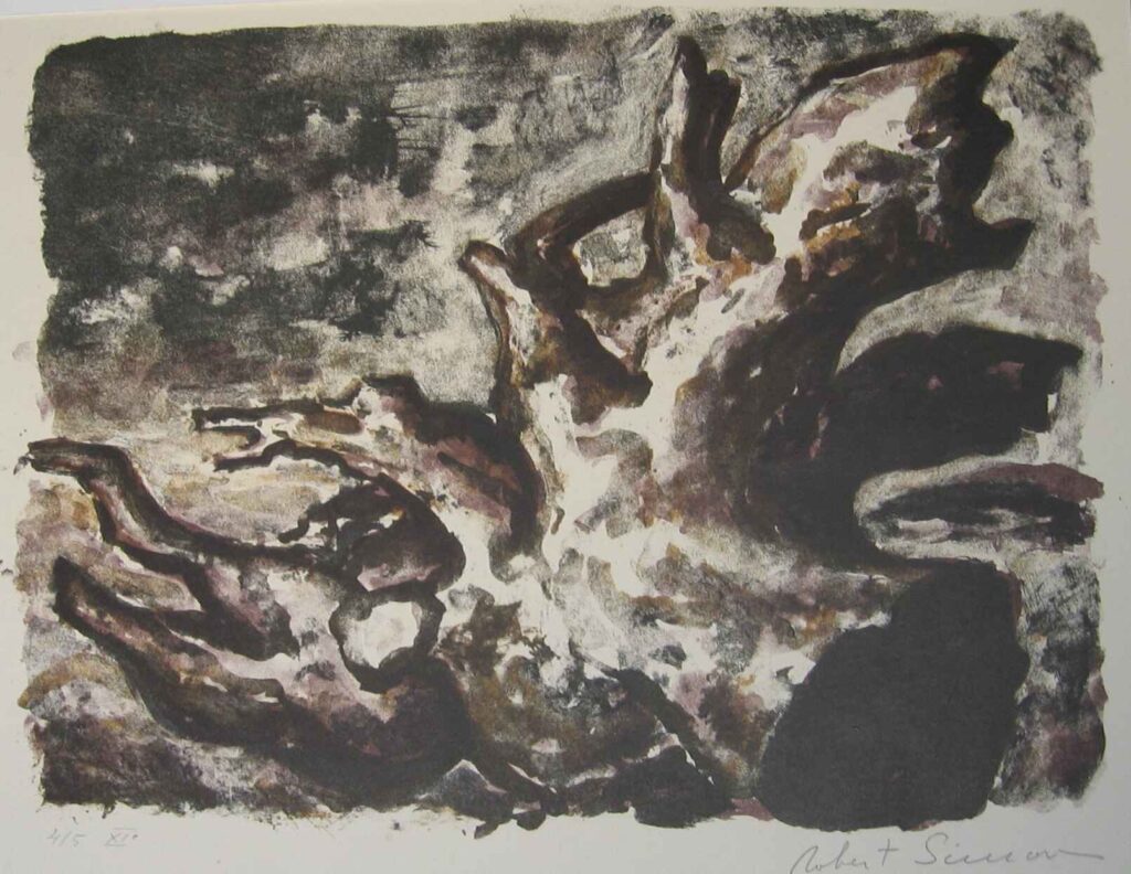 Il primo incontro con Robert Simon fu nell’agosto del 1981, quando partecipai al suo corso di litografia sperimentale che si teneva nella sede della Scuola Internazionale di Grafica di Venezia, allora situata sul Canal Grande di fronte all’Archivio della Biennale. Lavoravo da pochi mesi nella Scuola di grafica e di litografia ne sapevo ancora ben poco. Nel mese precedente avevo partecipato al corso tenuto da Romolo Milani e Luca Crippa e avevo avuto modo di conoscere le prime rudimentali nozioni su questa complessa tecnica di stampa d’arte. In questo corso tenuto da Simon ero stato inserito come assistente di fotolitografia, tecnica con la quale avevo più pratica. Simon aveva portato con sé una coppia di allievi da Mulhouse (Francia), dove teneva lezione, che lo aiutarono nella stampa delle pietre e delle lastre. Il mio compito di assistente fu relegato agli ultimi tre giorni di corso e consisteva inizialmente nell’imprimere in lastre lito presensibilizzate, tramite la luce di un bromografo, alcuni disegni che gli allievi avevano fatto con una matita grassa su carta da lucido. Questo mio intervento si concludeva con la stampa di queste lastre per mezzo di una scassata macchina offset industriale. La tecnica fotolitografica non era molto apprezzato da Simon che preferiva le litografie “originali” disegnate dall’artista direttamente sulle matrici, ma tollerò con molta bonomia il mio intervento e mi lasciò fare con la massima libertà. Da allora ci siamo visti ogni anno per quasi quindici anni: lui come maestro ed io come assistente, non più di fotolito ma di litografia “originale” coadiuvandolo nel seguire gli allievi nei vari passaggi tecnici e aiutandoli a stampare.