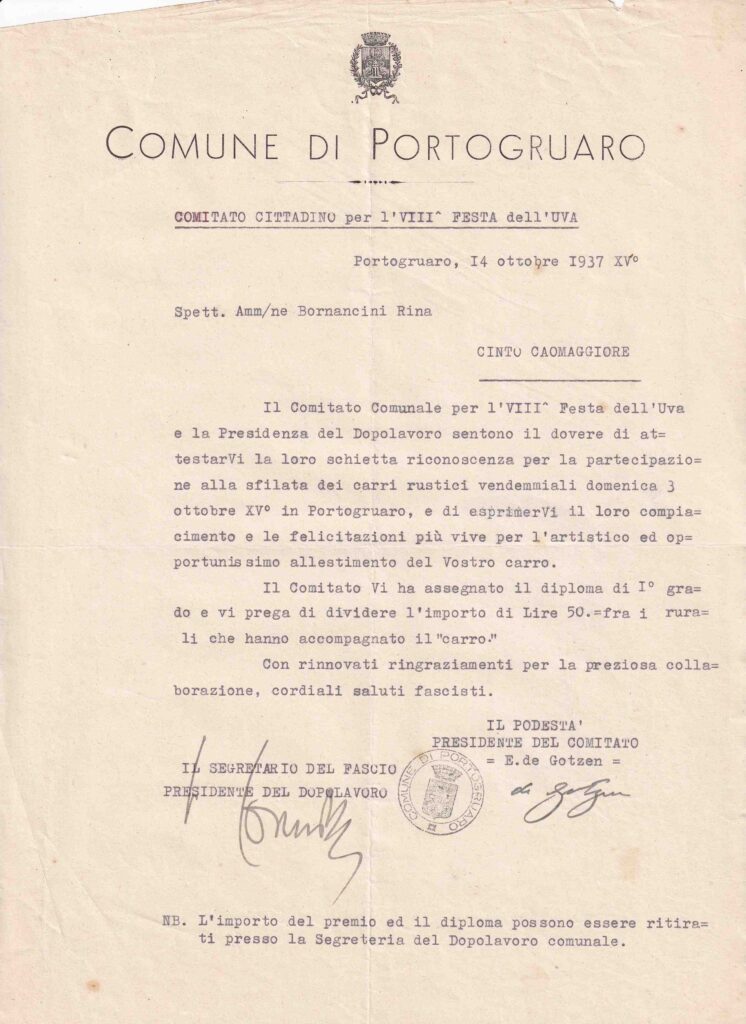 Al carro cintese dell’Azienda Bornancini che partecipò alla VIII festa dell’uva di Portogruaro venne assegnato “il diploma di I° grado”, mentre il premio consisteva in 50 lire (circa 60 euro di oggi) da dividere con tutti i partecipanti alla sfilata.
