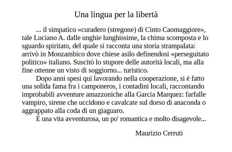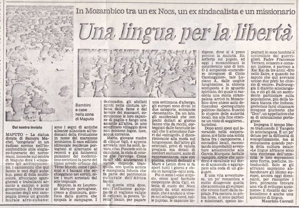 All’interno dell’articolo “Una lingua per la libertà”, apparso sul Gazzettino nel settembre 1989, che descrive lo stato africano del Mozambico ci sono alcune frasi che riguardano l’attività di Luciano. Si tratta di breve ritratto un po’ caricato giornalisticamente ma che evidenzia la grande fantasia e maestria di Luciano nel “fabulare” e nell’intrattenere rapporti affabili e paritari con le popolazioni più umili.